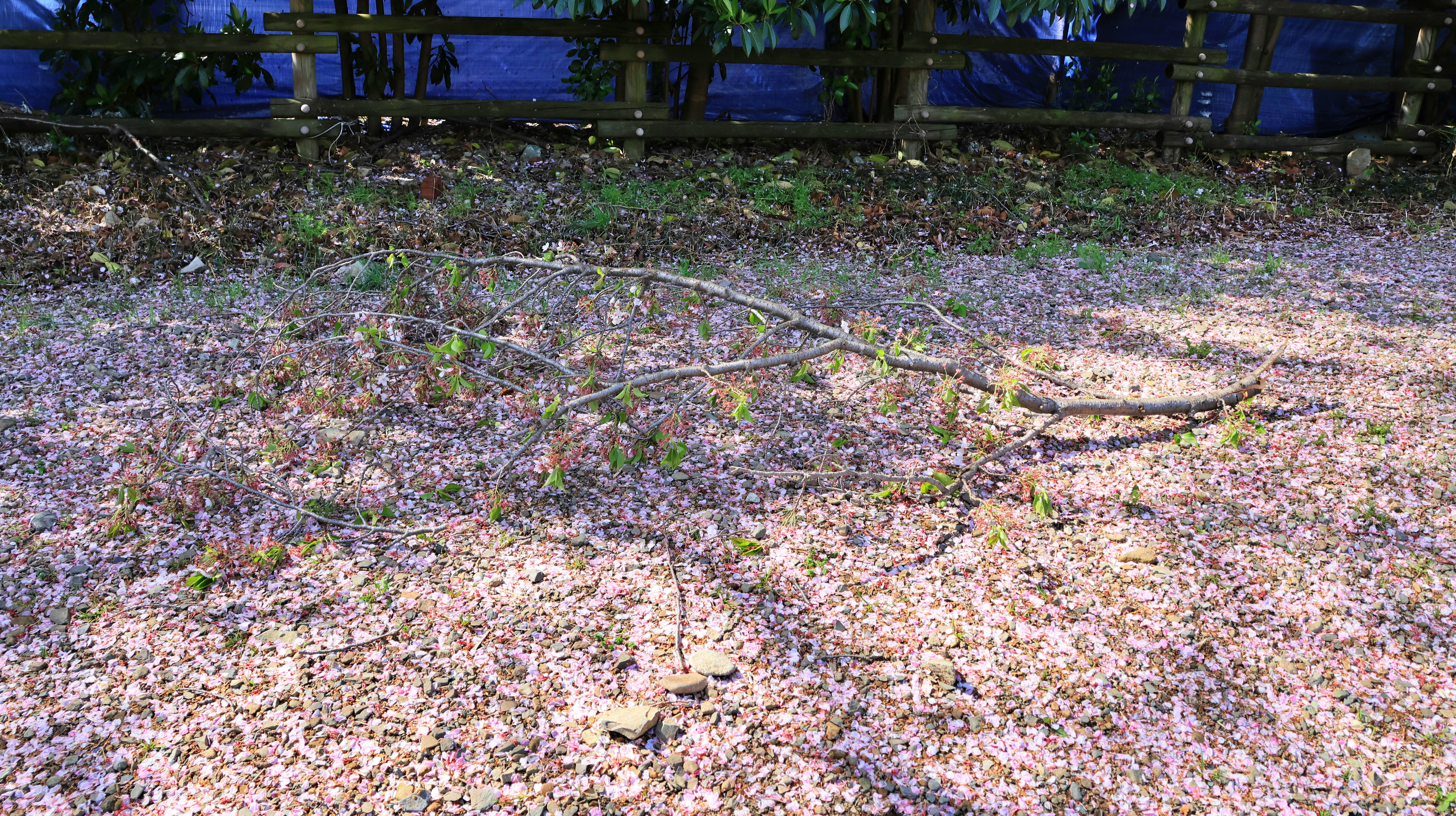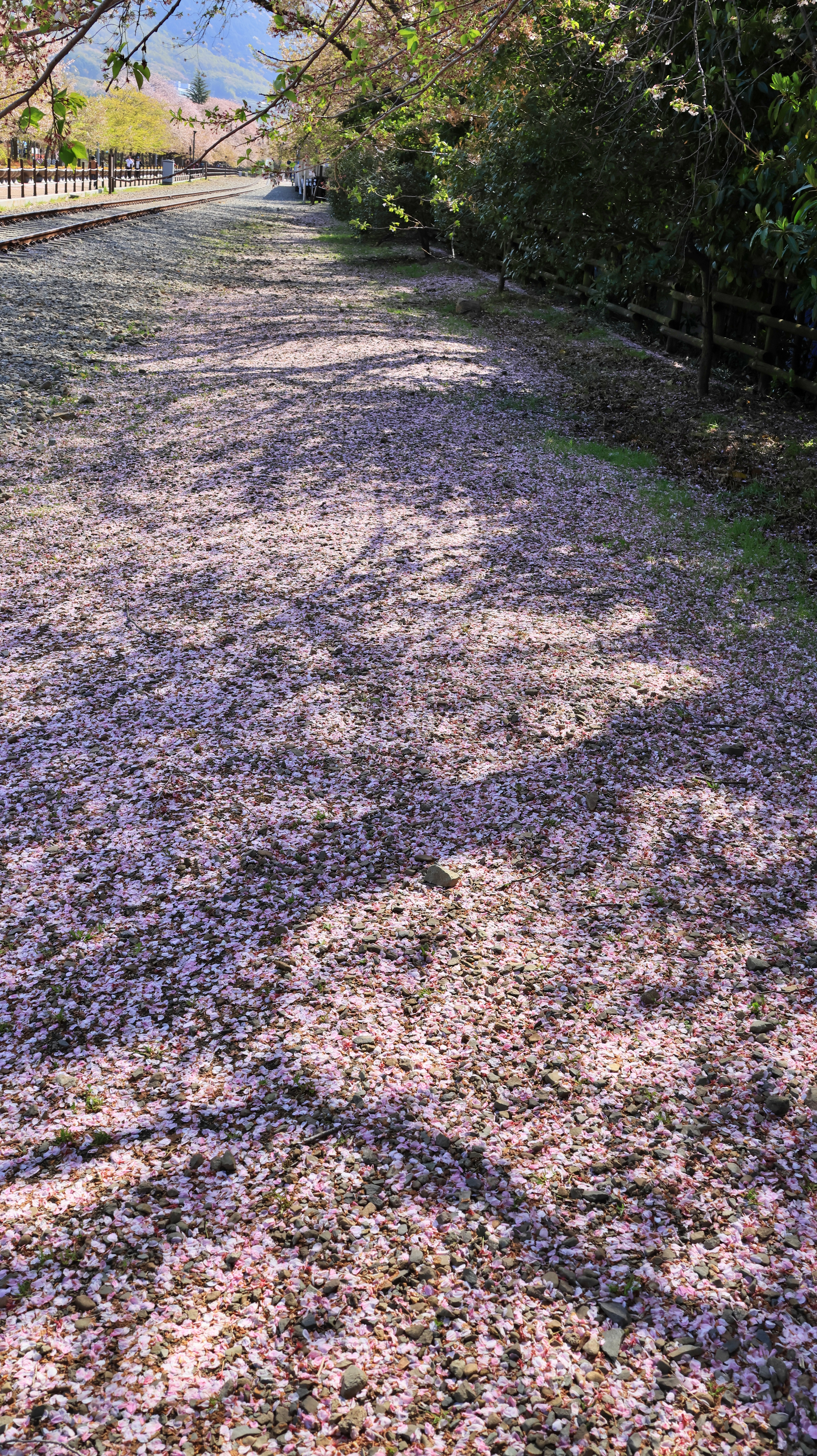 자갈을 덮어놓은 땅에는 꽃이파리가 뒤덮여 있고.