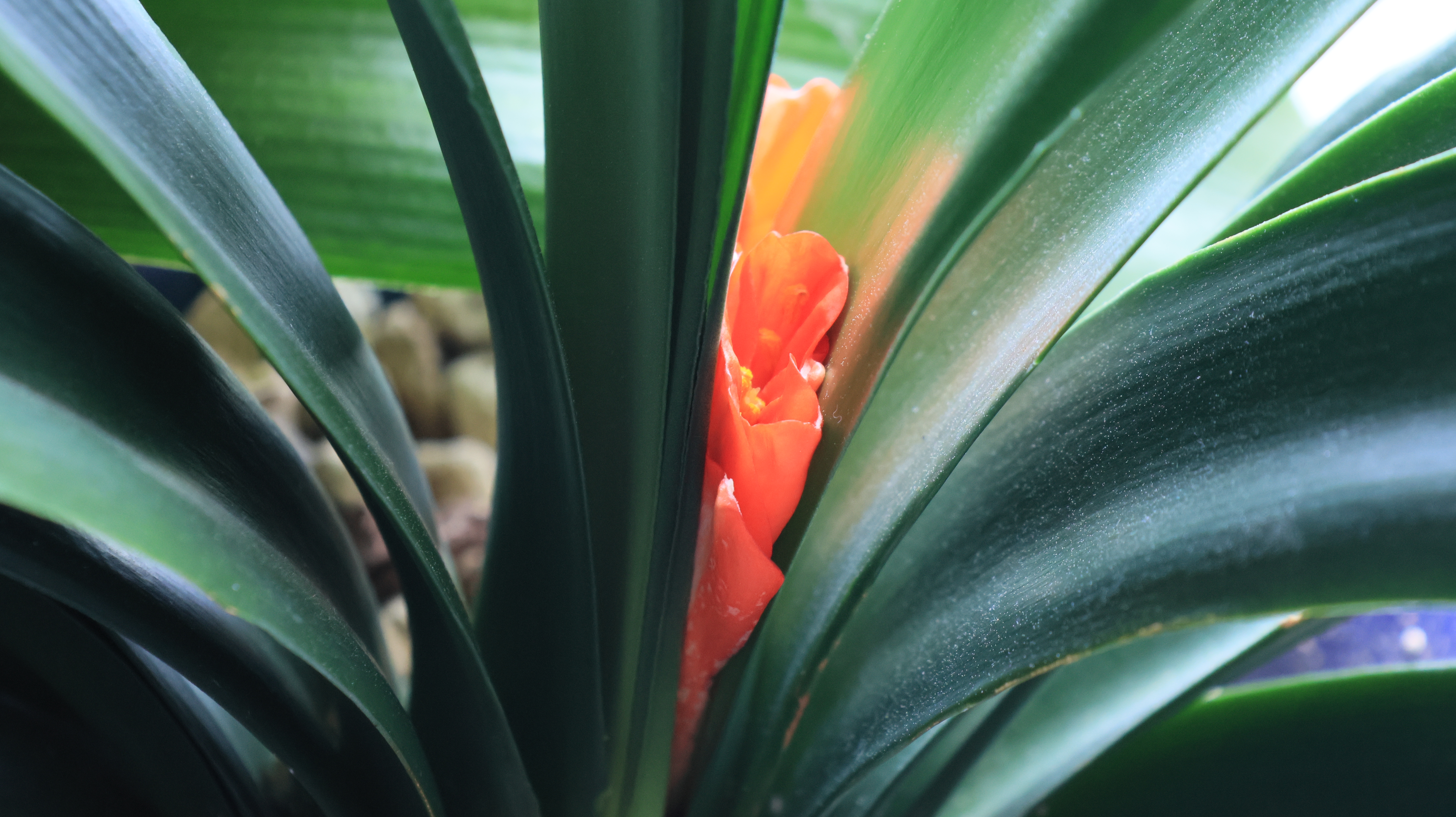 군자란 꽃대는 키를 키우지 못해 우악스런 잎에 눌려버렸다.
