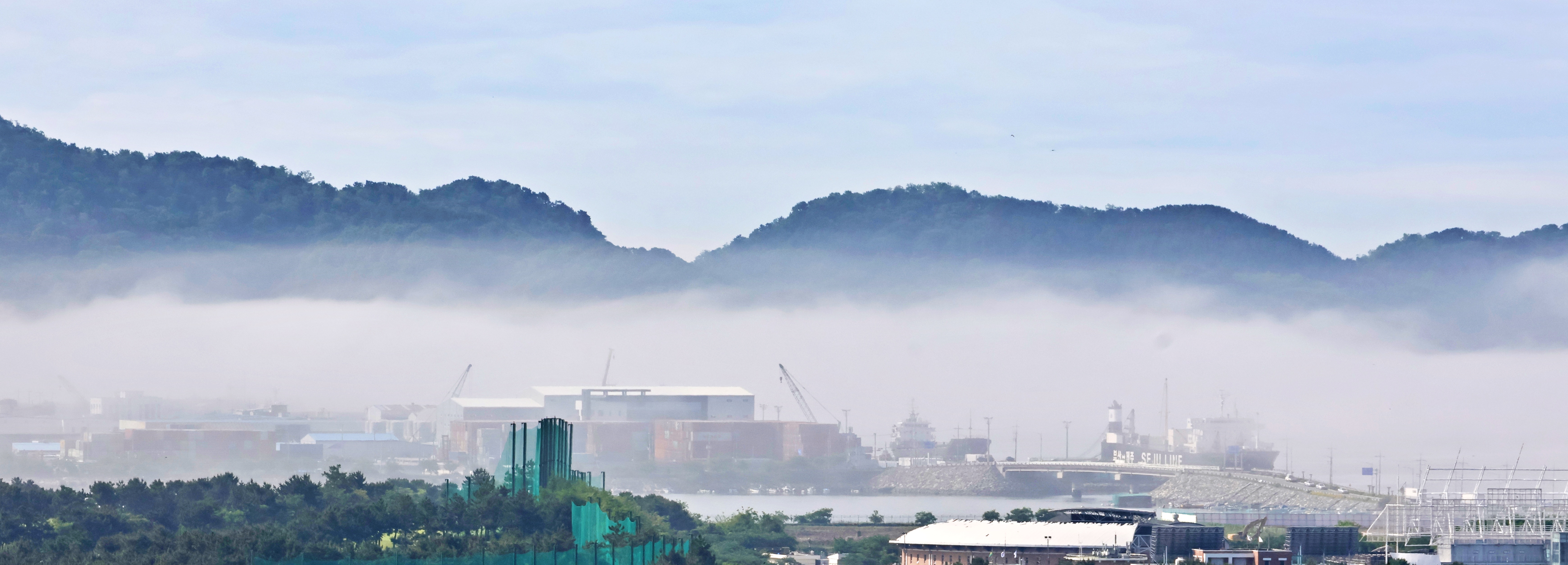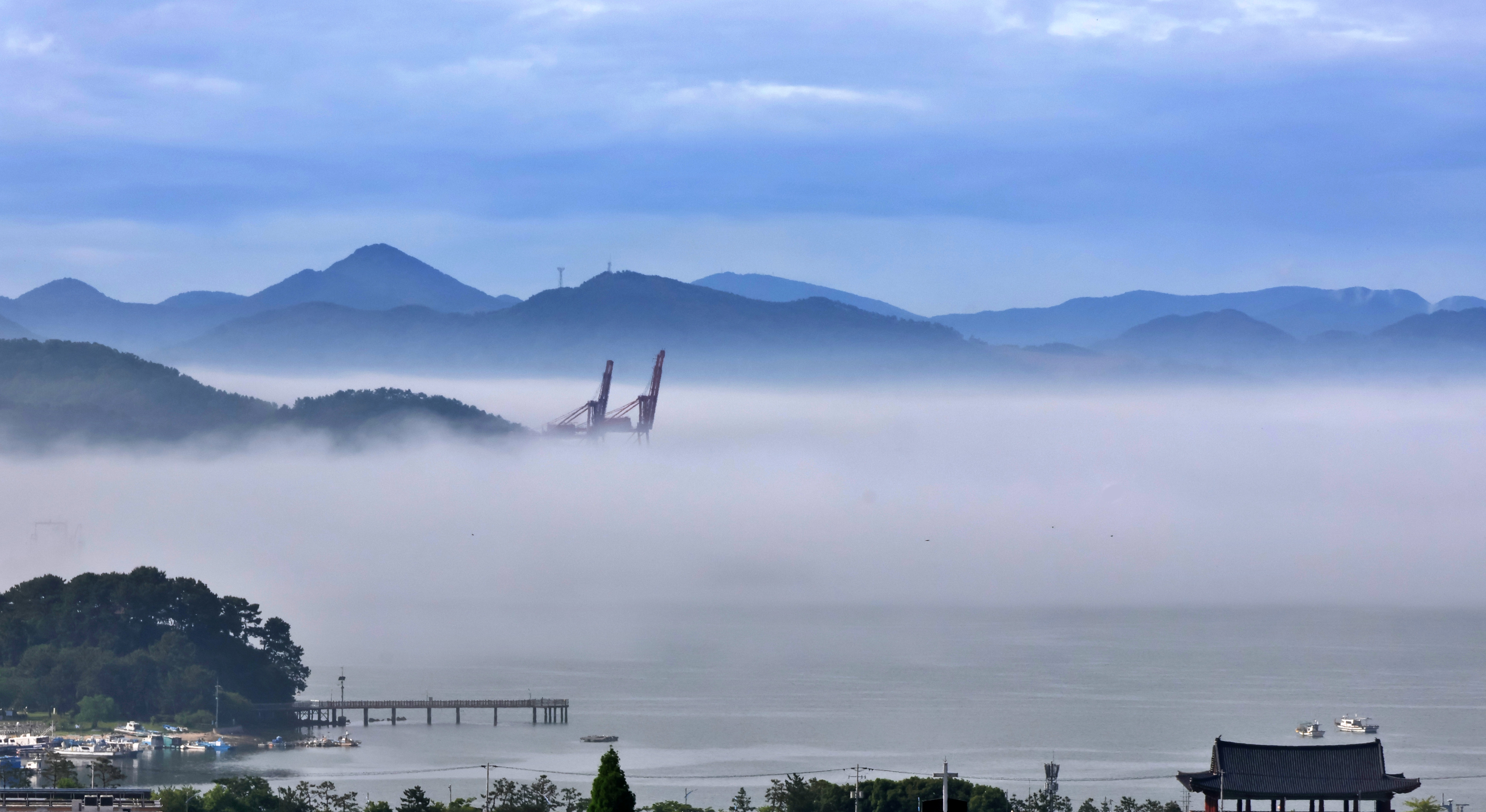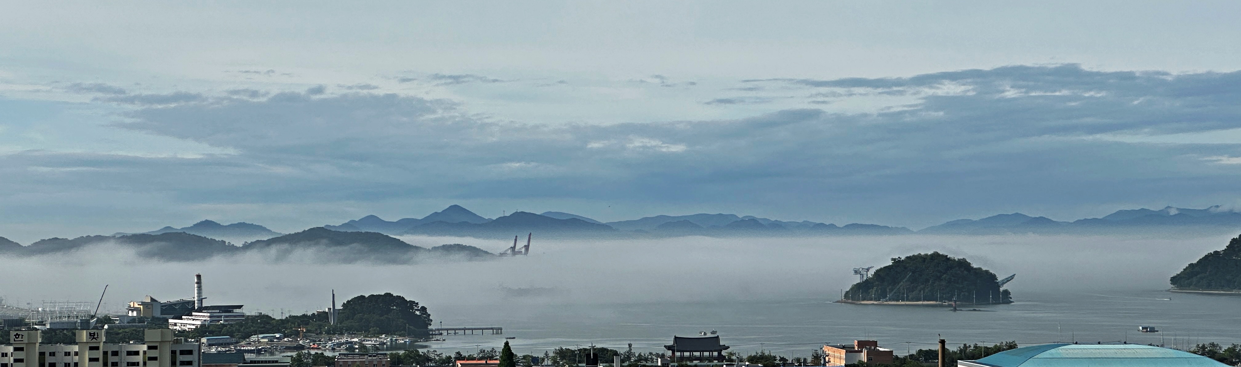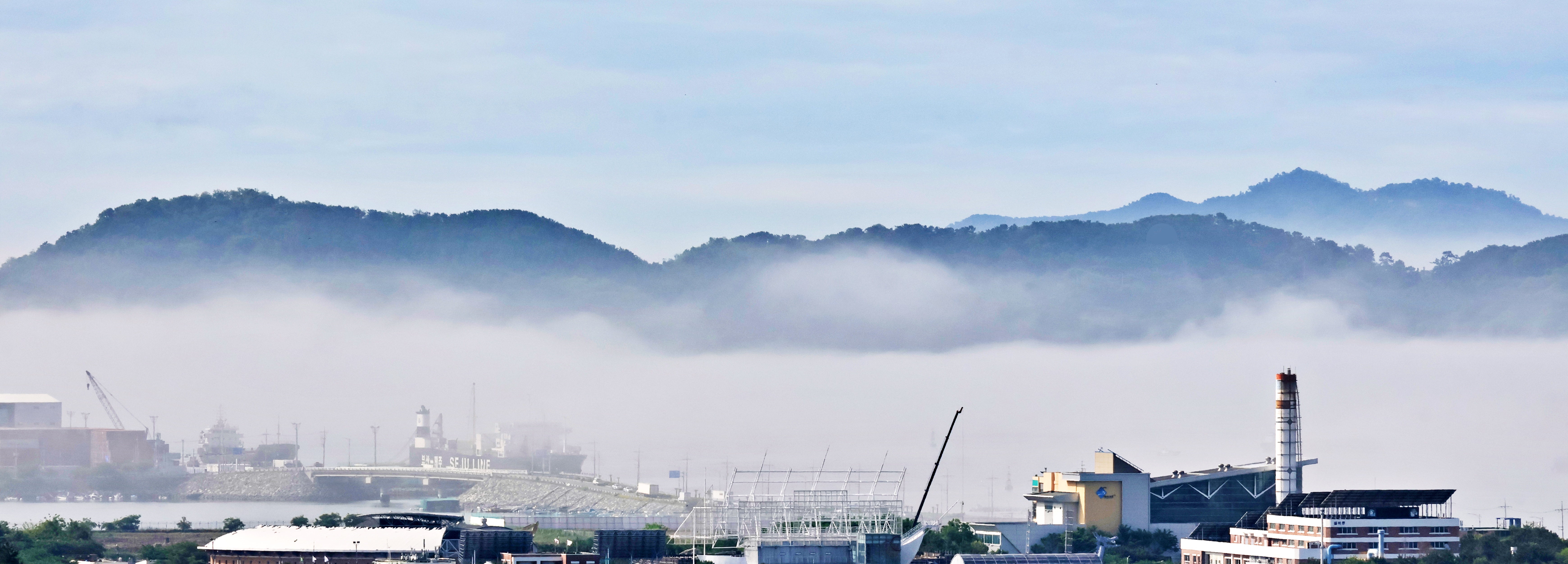 항상 여남 척의 배가 정박하고 있는데 안개에 가려 한 척도 보이지 않는다. 단지 대죽도와 행암 부두의 크레인이 제 키 자랑하 듯 드러나 보일 뿐.