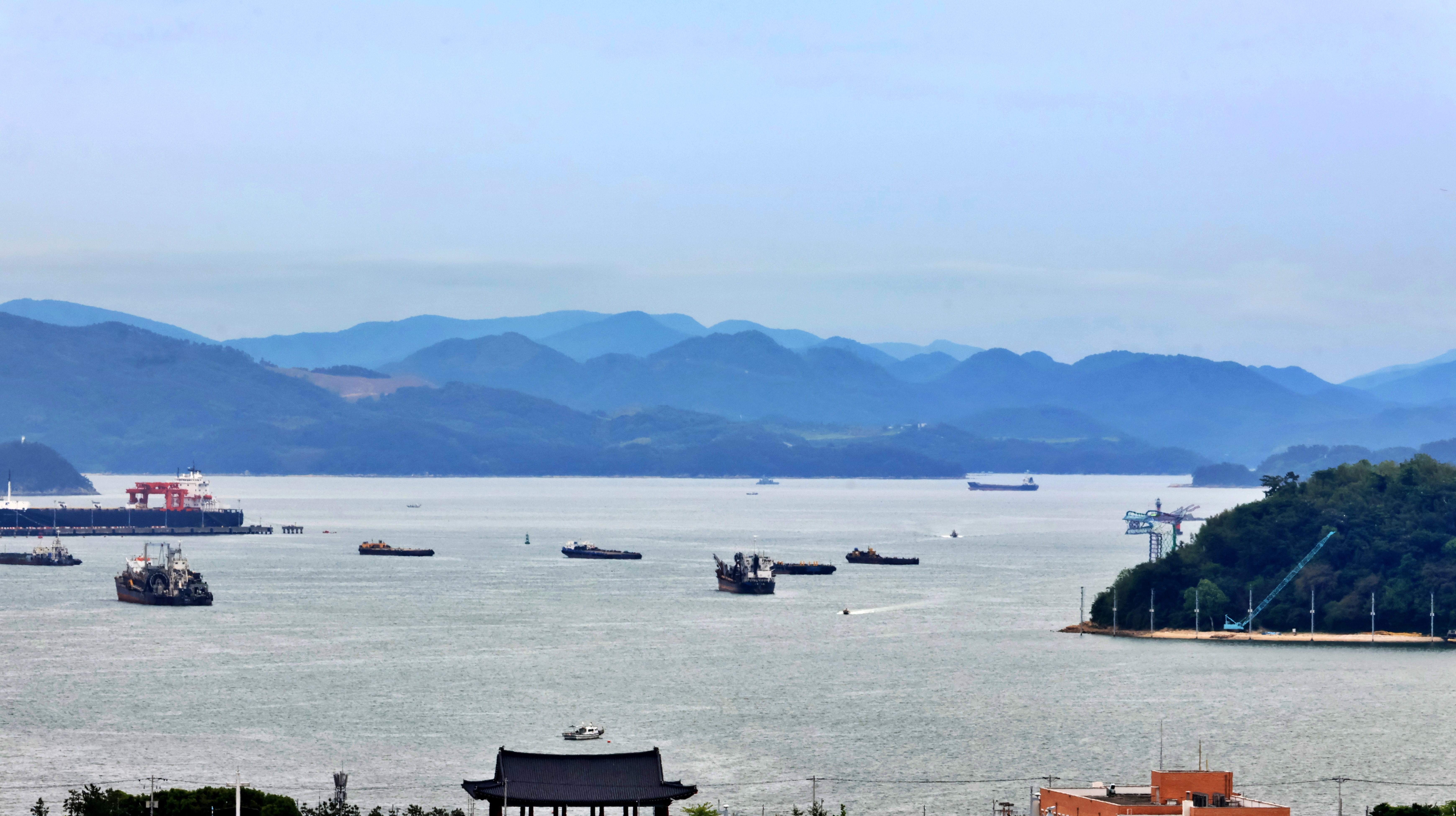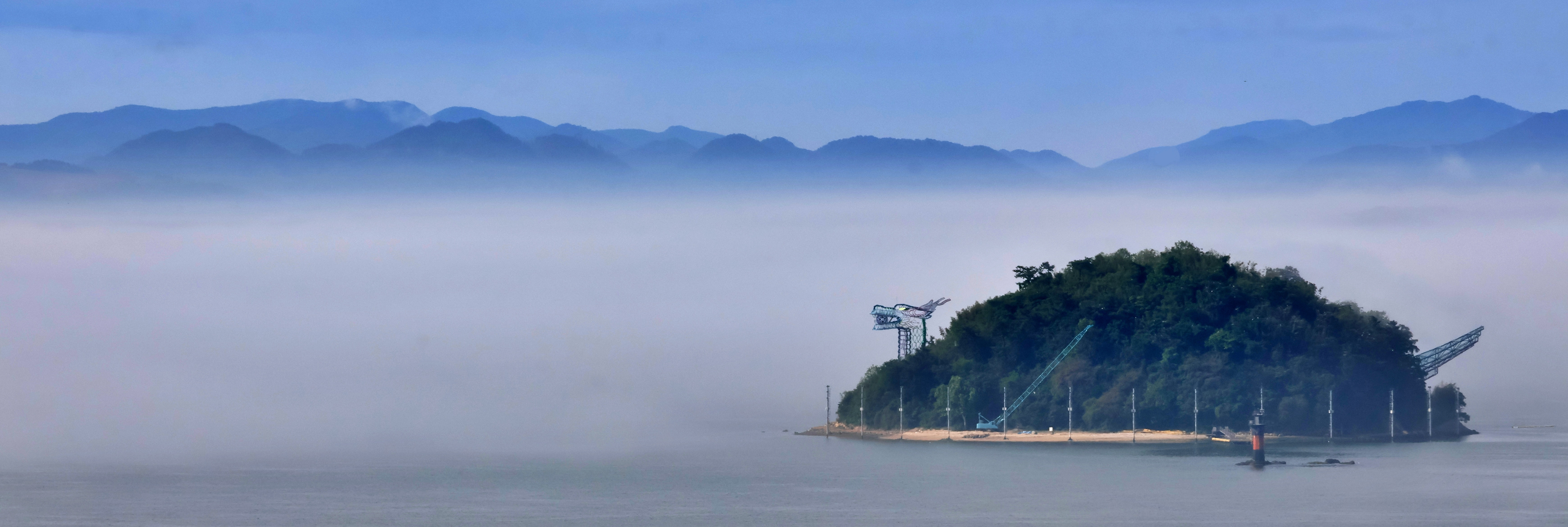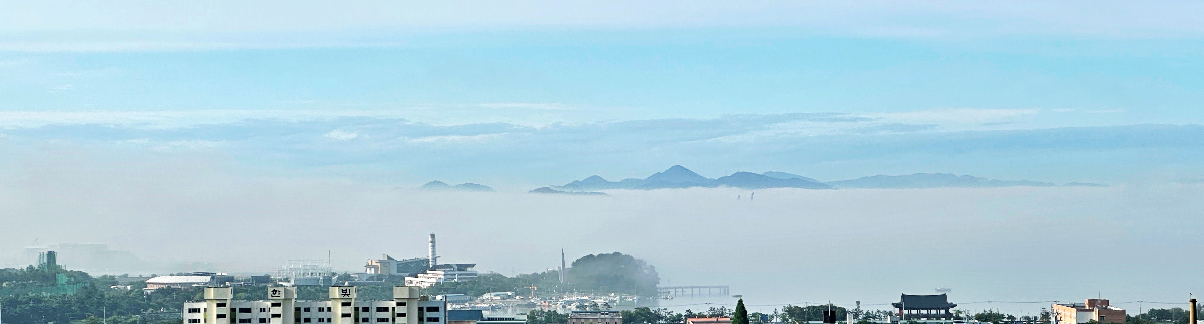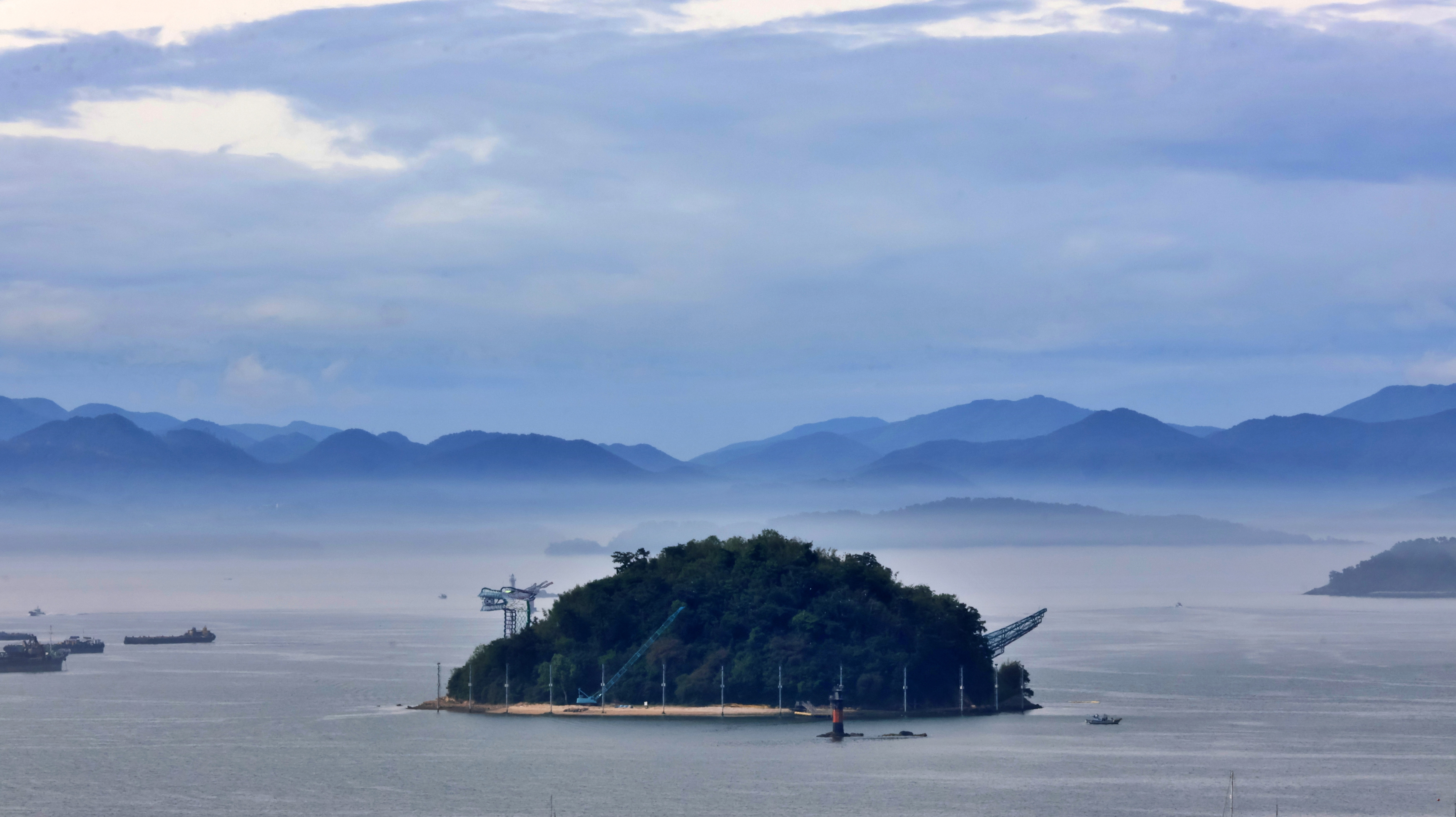 항상 여남 척의 배가 정박하고 있는데 안개에 가려 한 척도 보이지 않는다. 단지 대죽도와 행암 부두의 크레인이 제 키 자랑하 듯 드러나 보일 뿐.