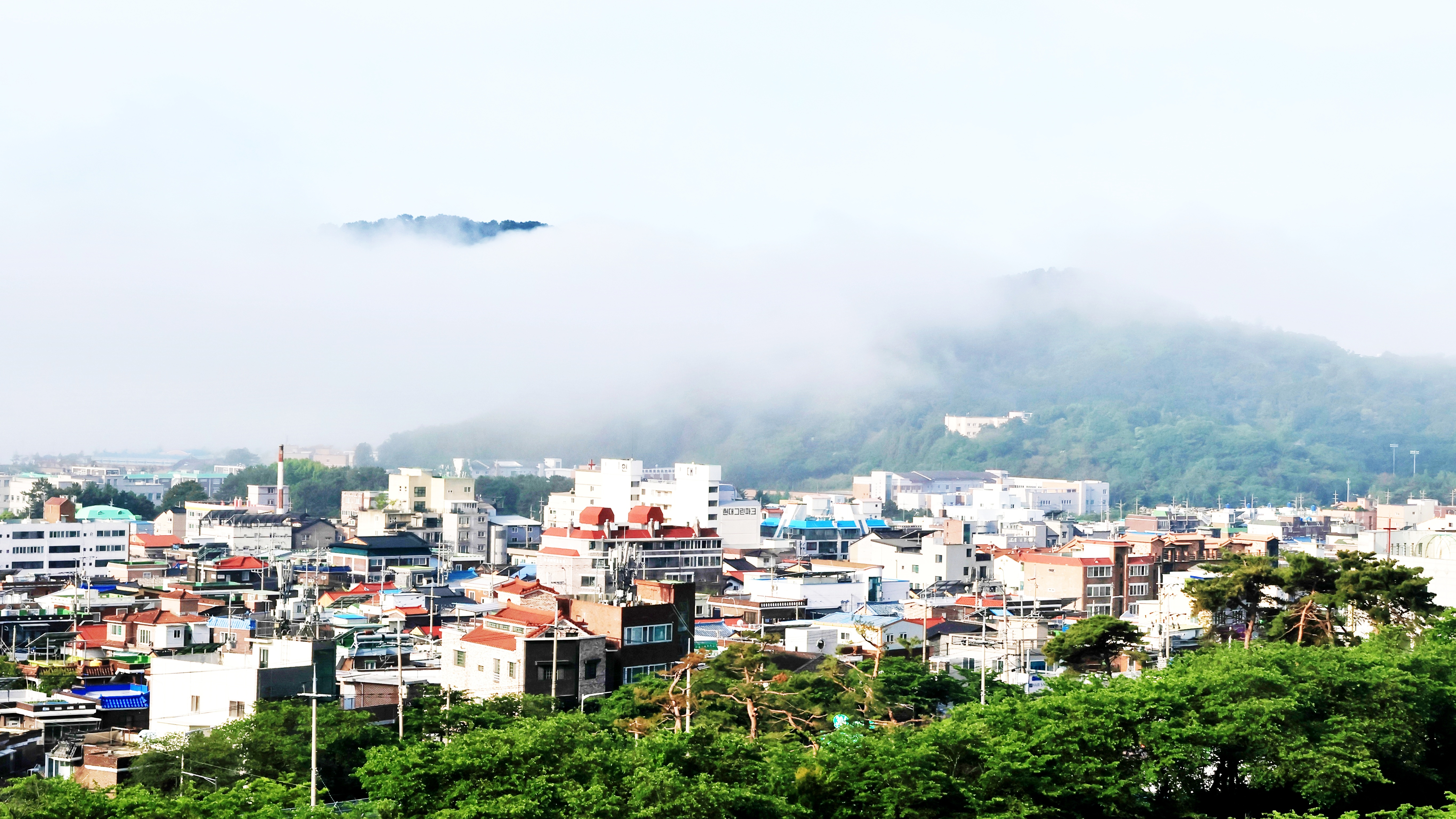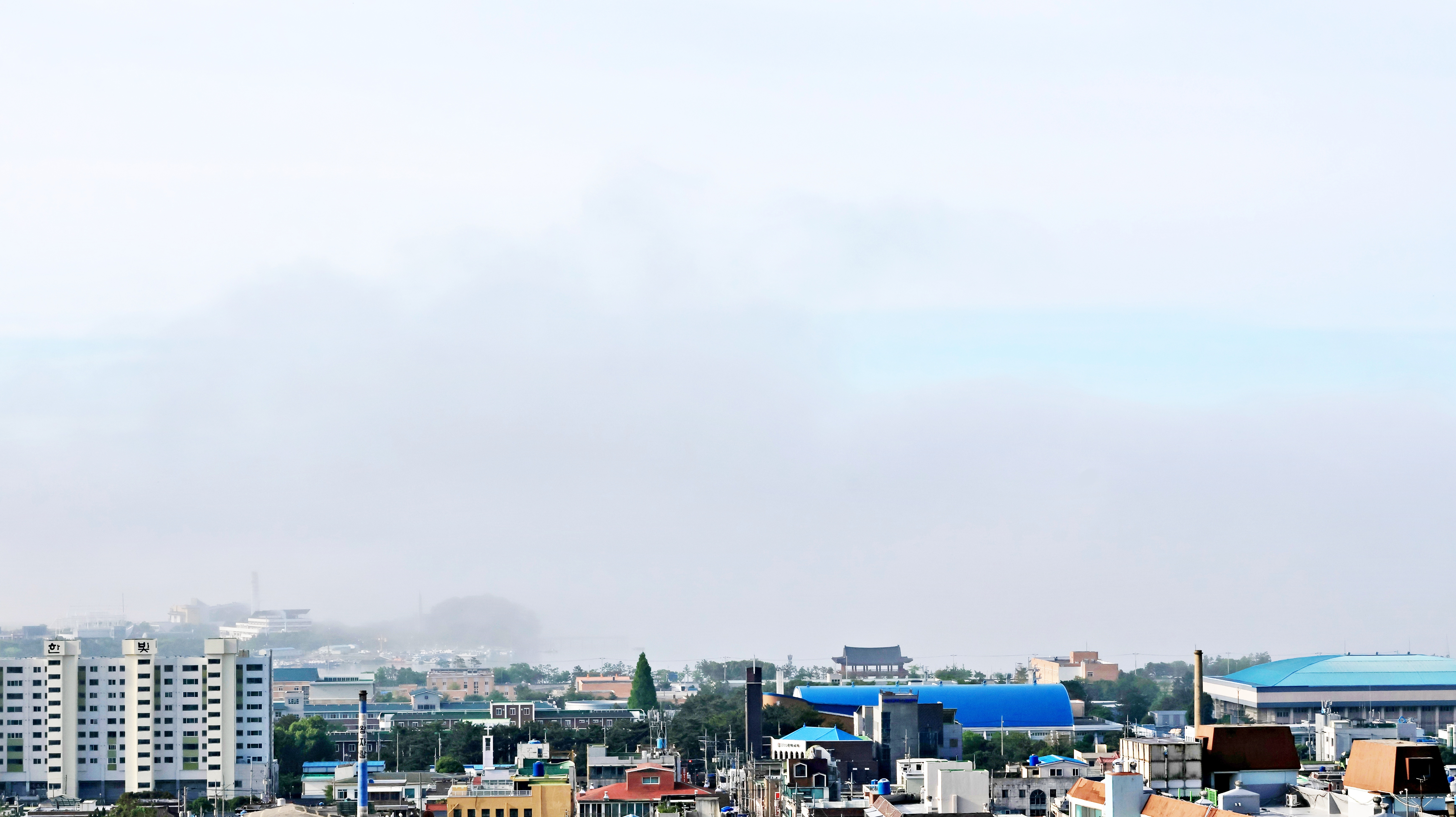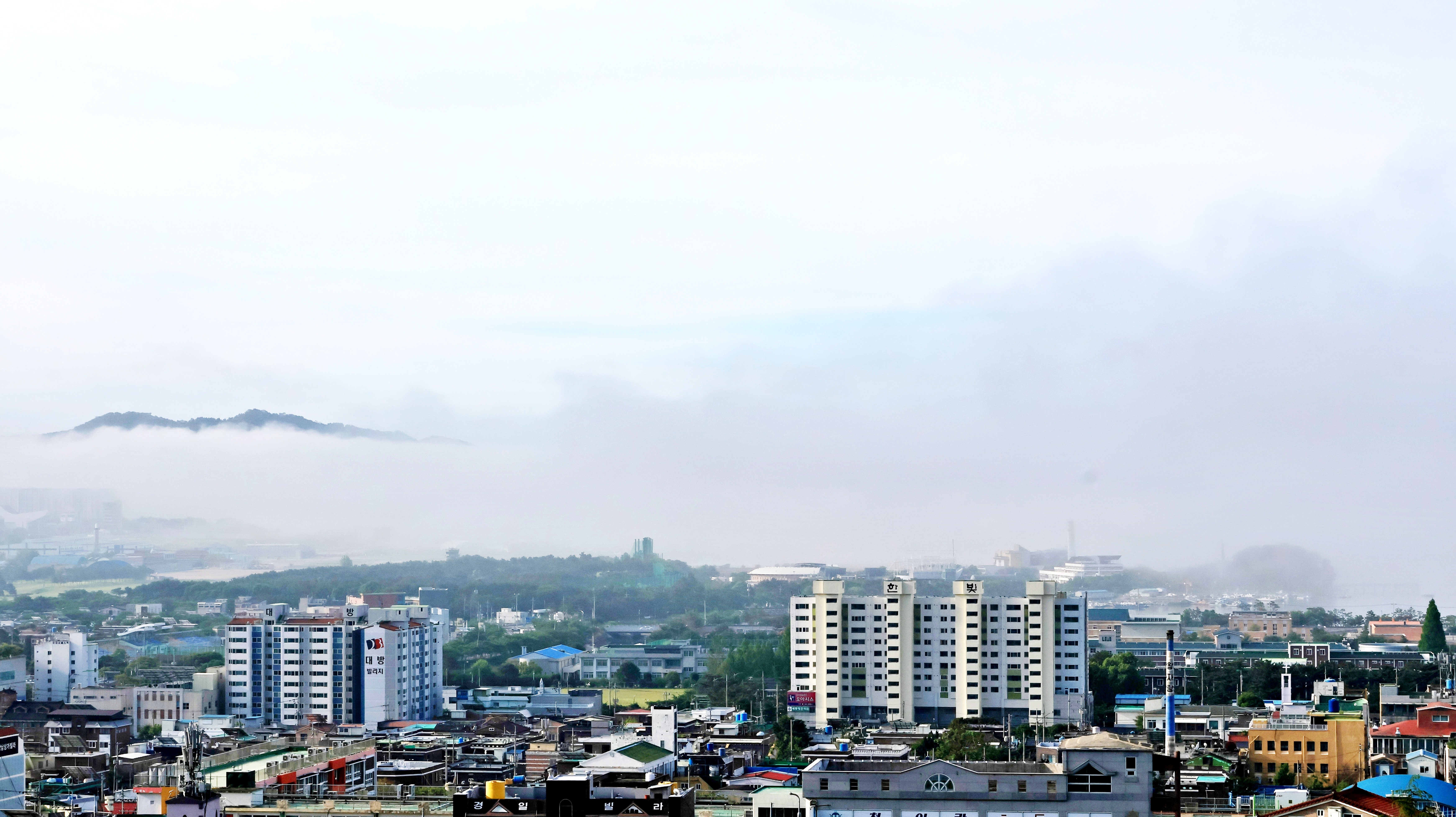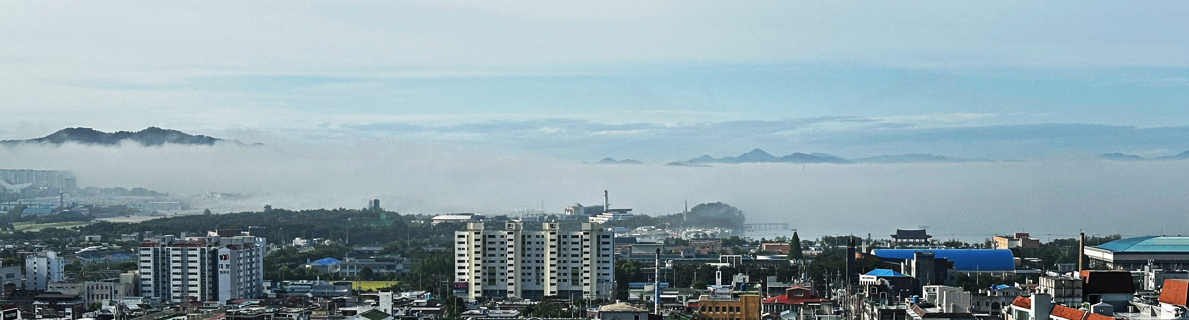 항상 여남 척의 배가 정박하고 있는데 안개에 가려 한 척도 보이지 않는다. 단지 대죽도와 행암 부두의 크레인이 제 키 자랑하 듯 드러나 보일 뿐.