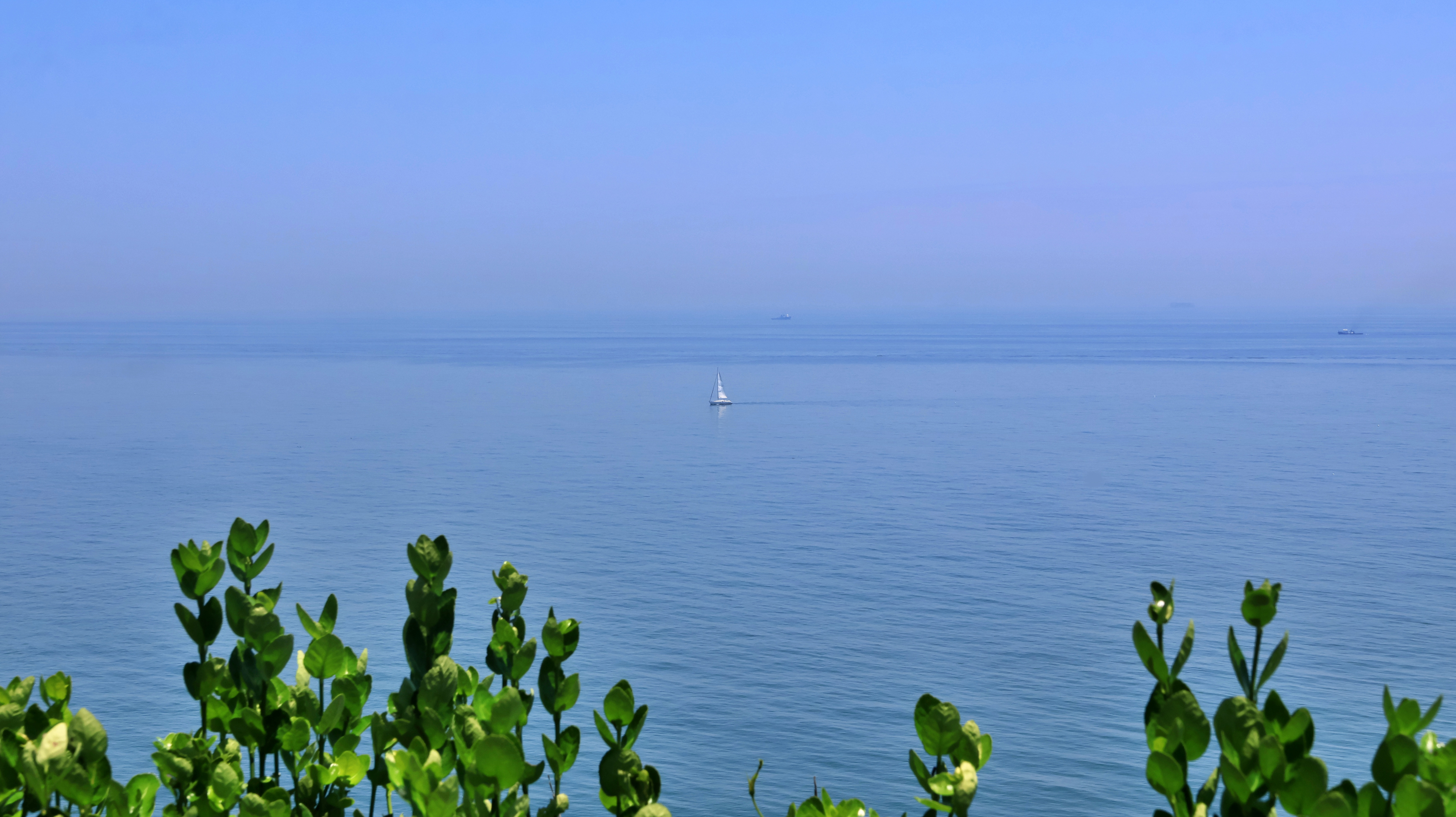 이기대 해안산책로. 산봉우리 7부 능선 쯤에서 산허리를 감고 돌아간다.요트 한 대가 잔잔한 바다를 가로질러 해운대 쪽으로 향하고 있다.
