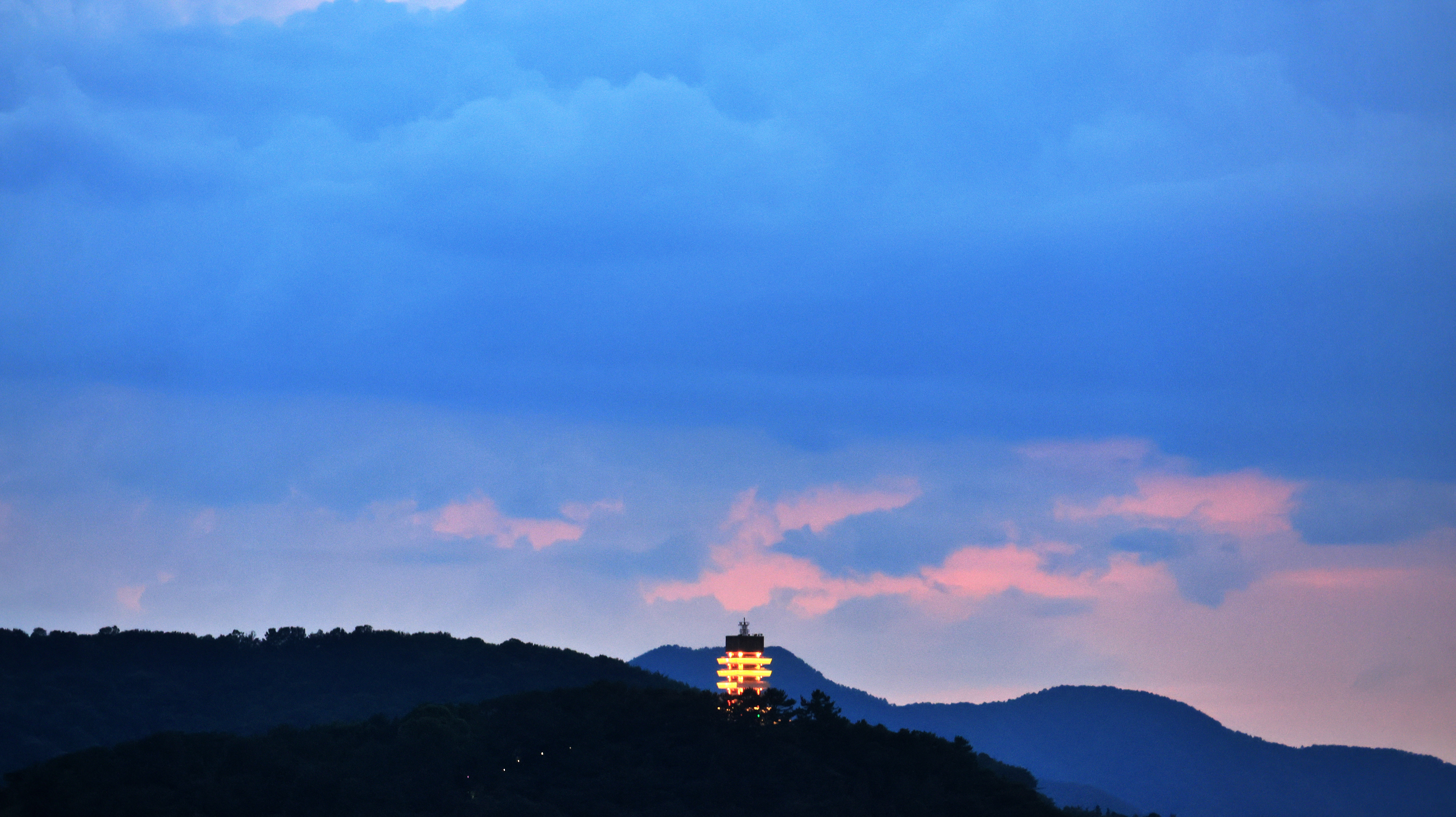 서쪽 진해탑 너머로 노을이 설핏 보인다.