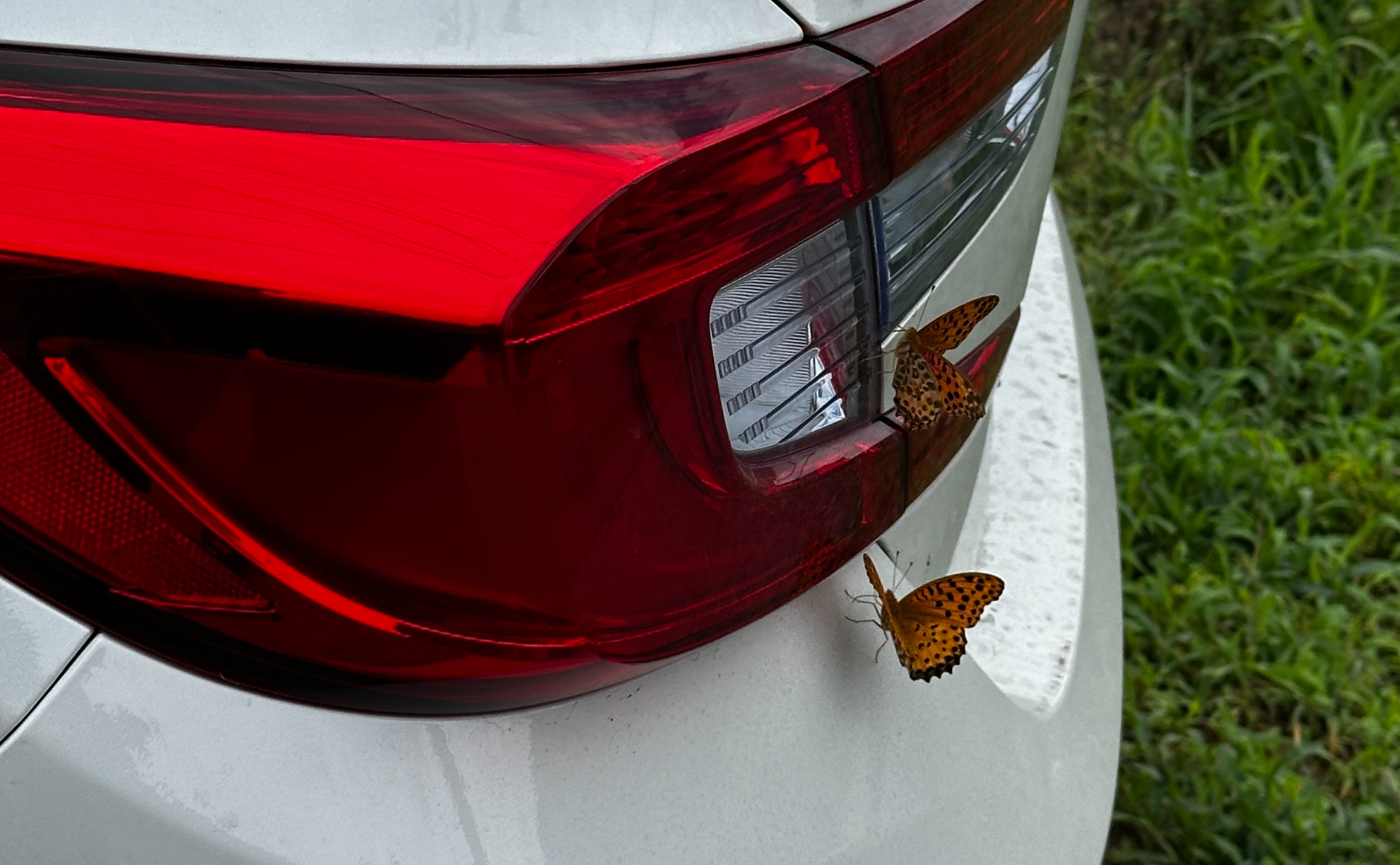 심은 이후 처음으로 수확한 복숭아복숭아를 트렁크에 실어두었더니 나비가 어찌 알았는지 여남은 마리가 주변을 맴돌고 있었다.