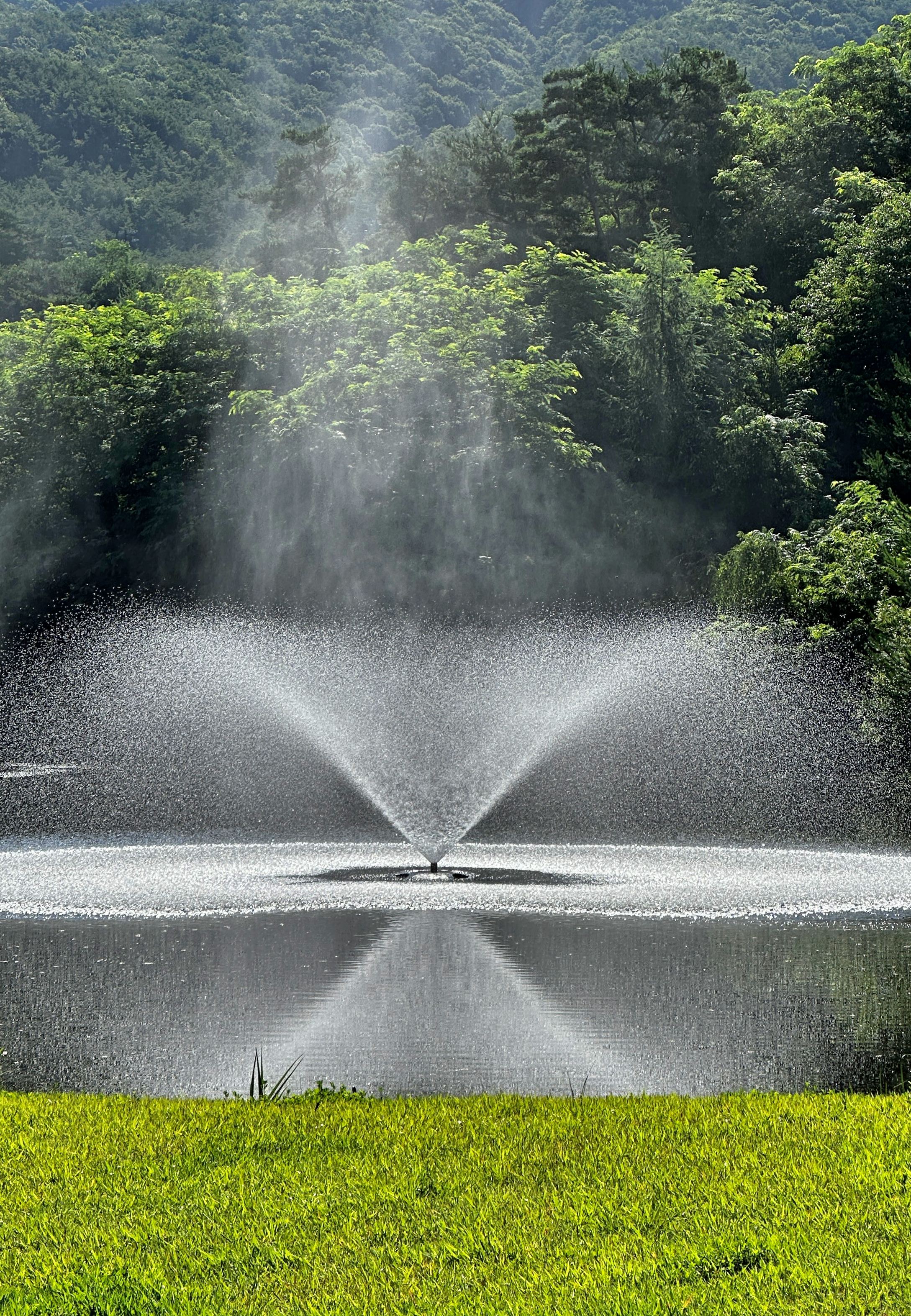 비에 씻긴 녹음을 배경으로 한 분수가 싱그럽다.
