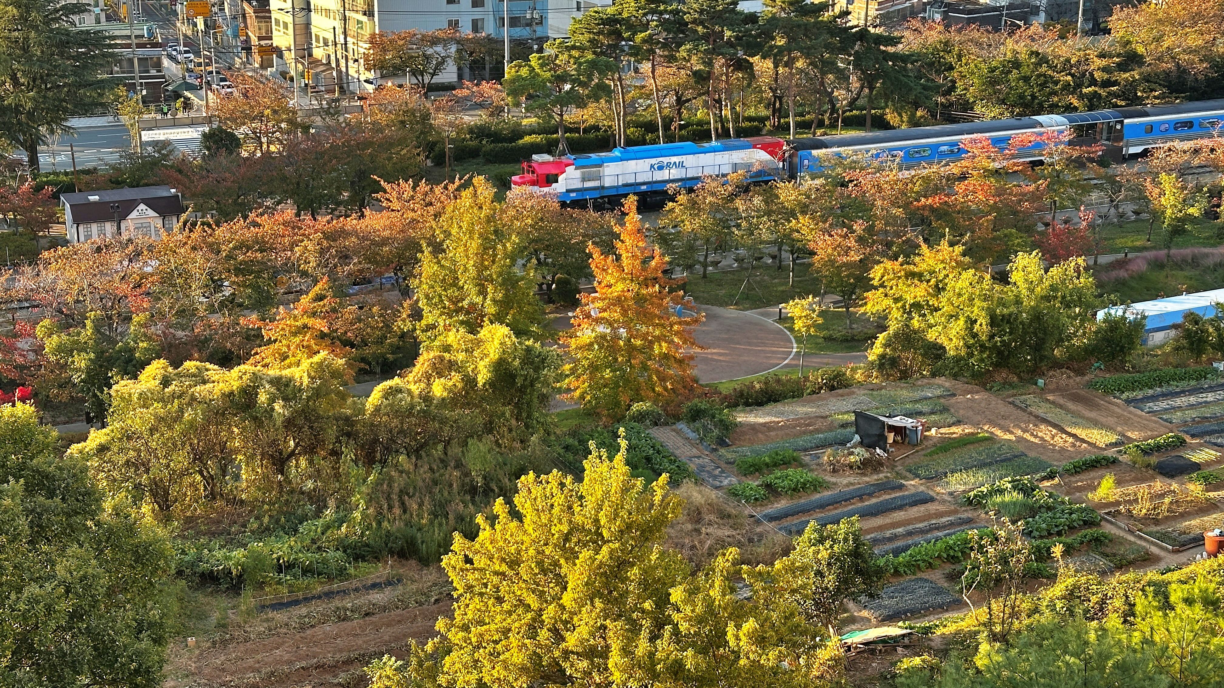 창밖으로 내다보이는 경화역공원은 가을의 현란한 색채를 뽐내고 있다.