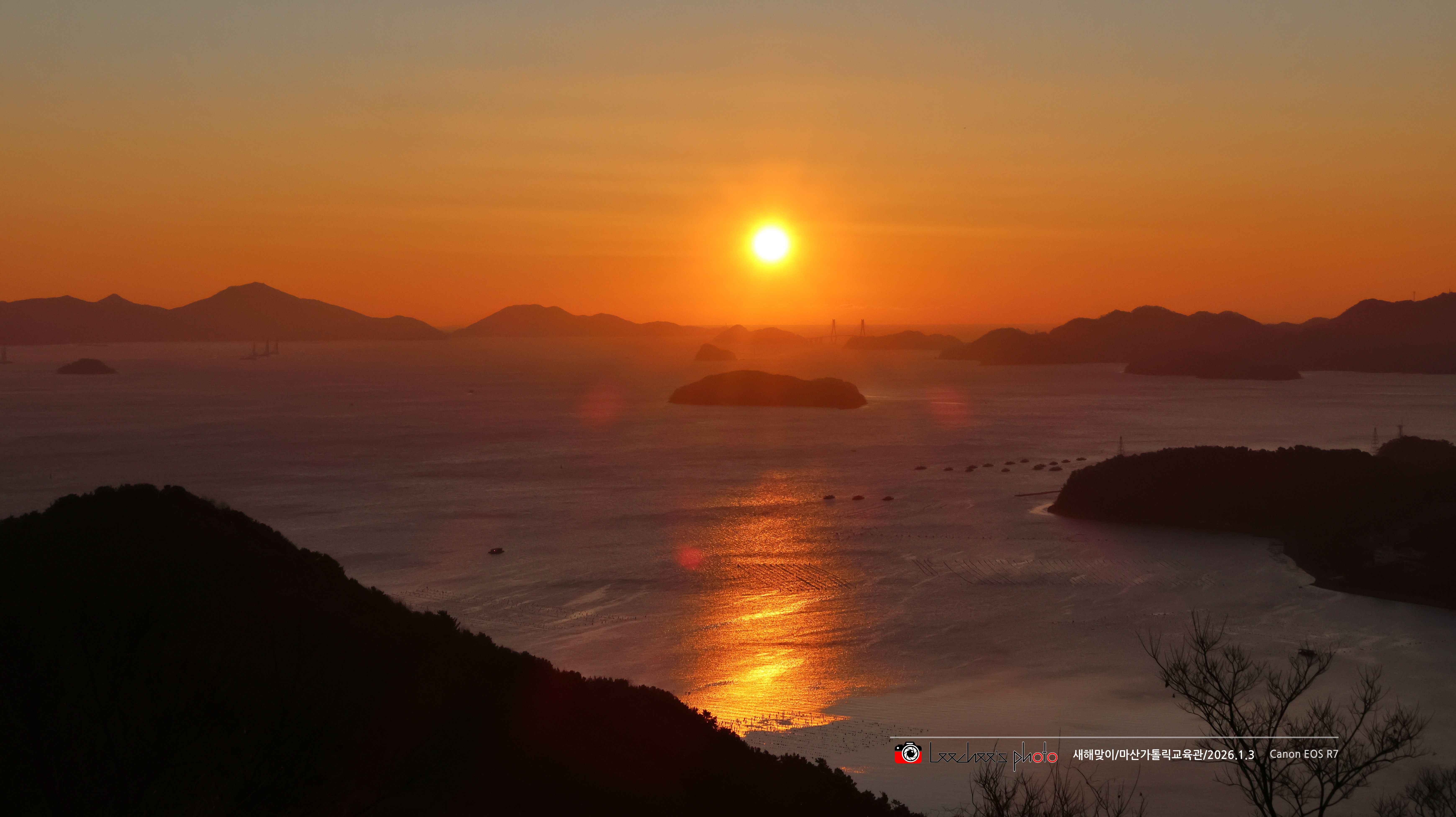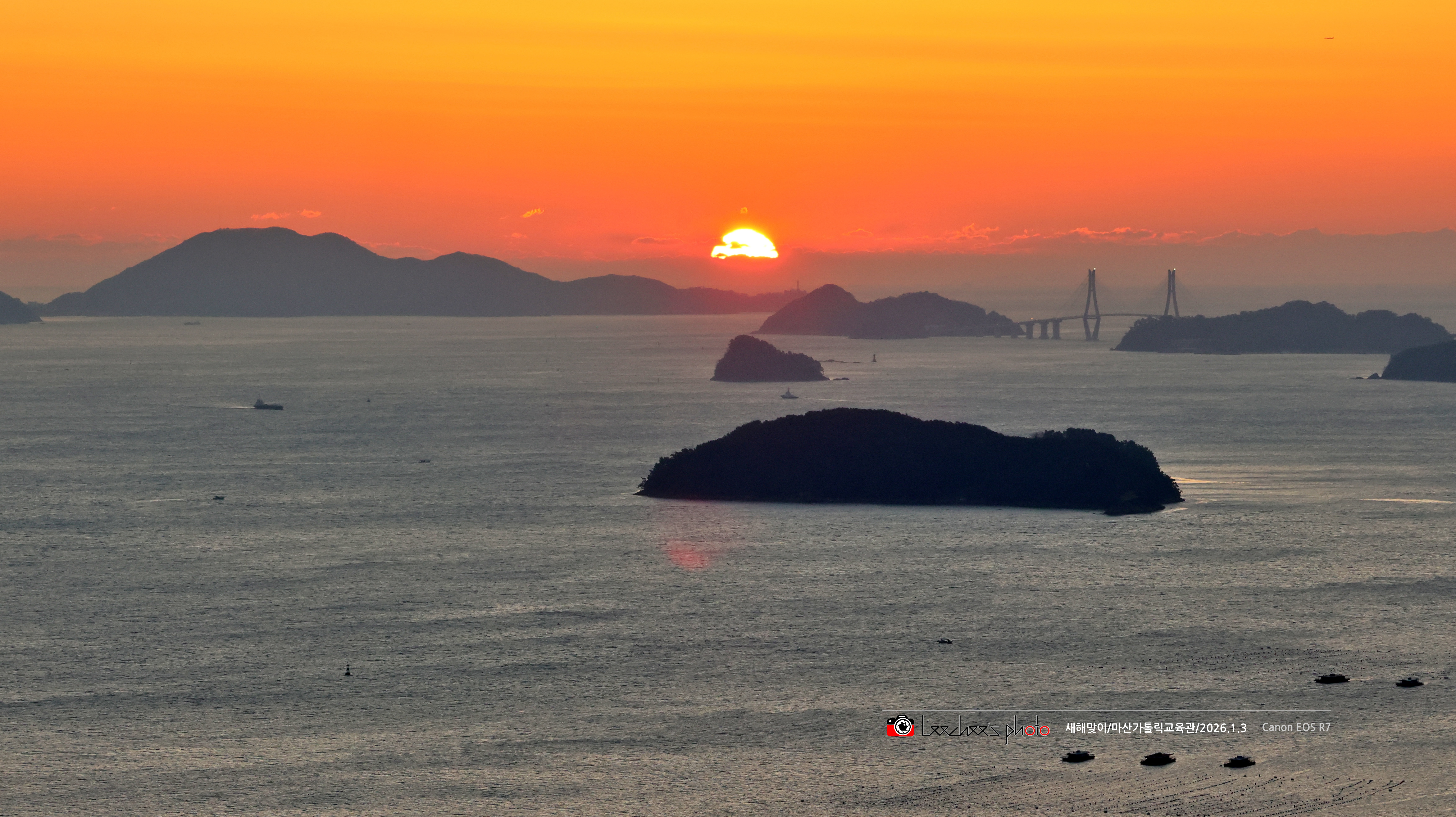 해는 가덕도 끝자락과 대죽도 사이에서 떠오른다. 거가대교는 왼쪽의 대죽도와 오른쪽의 저도를 이어주는 다리다. 대죽도와 가덕도 사이는 해저터널로 이어지고.