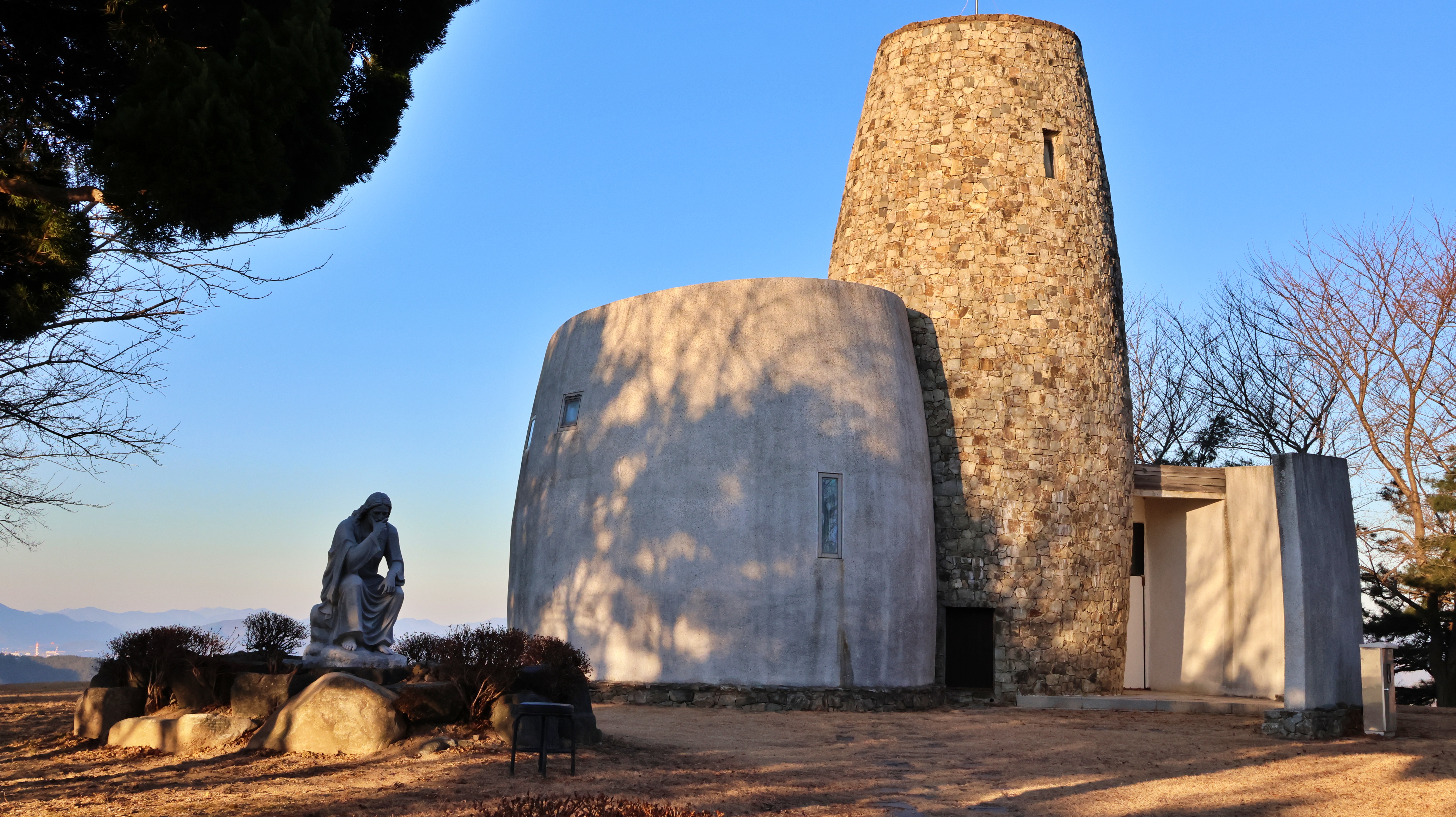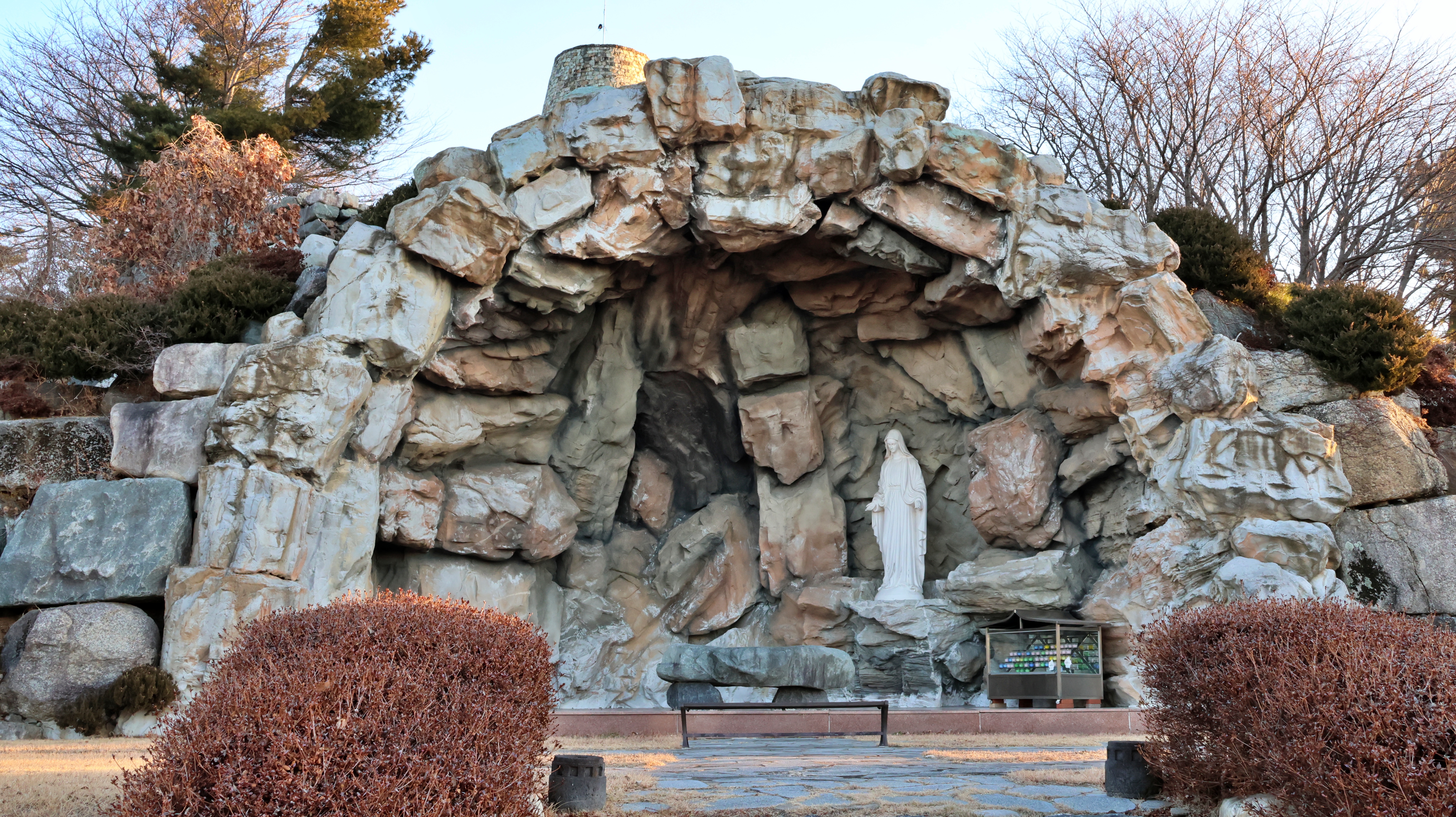 두 건물 사이를 통과하면 성모마리아상이 모셔져 있는 시멘트 구조물이 나온다. 그 앞으로는 넓은 잔디밭이 조성되어 있다. '십자가의 길'이라는 안내판이 있는 오르막 길이 있고, 그 위에 봉화대로 착각할 만한 특이한 형태의 건물이 있는데 입구는 닫혀 있어 용도를 짐작하기 어려웠다.